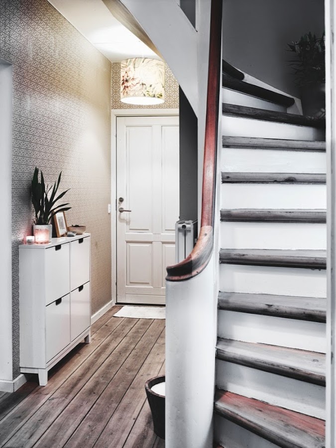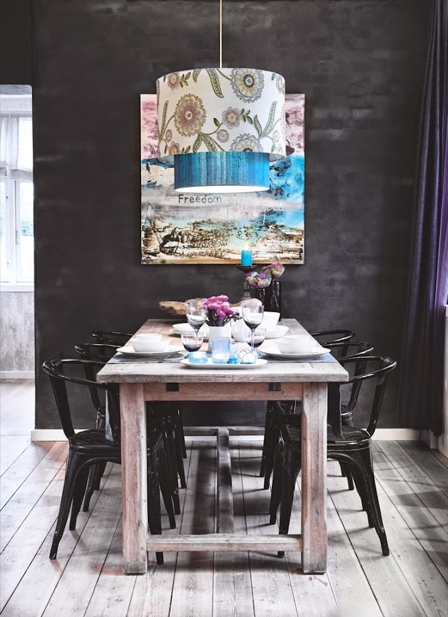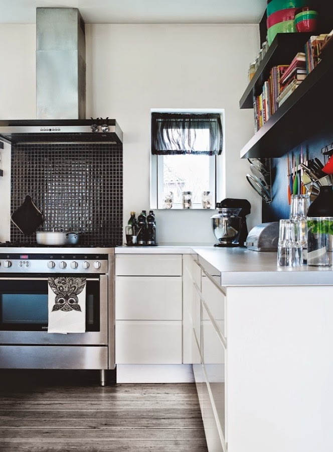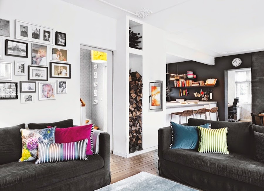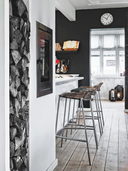 He aquí una casa sofisticada, donde predomina el negro pero no deja de ser cálida!! Esto ocurre en Dinamarca! ¿y cómo lo han conseguido? Pues con un suelo de madera rústica por toda la casa, telas pesadas y aterciopeladas en sillones, cojines, cortinas, un rinconcito con papel pintado y una decoración exquisita! Me encanta la leña ordenadita en el salón de casa!!