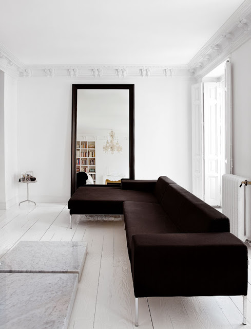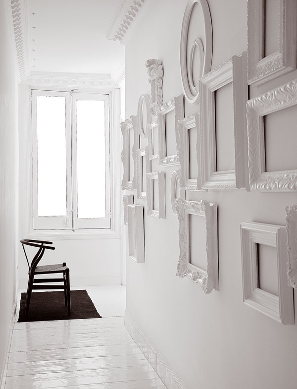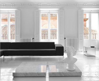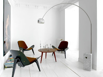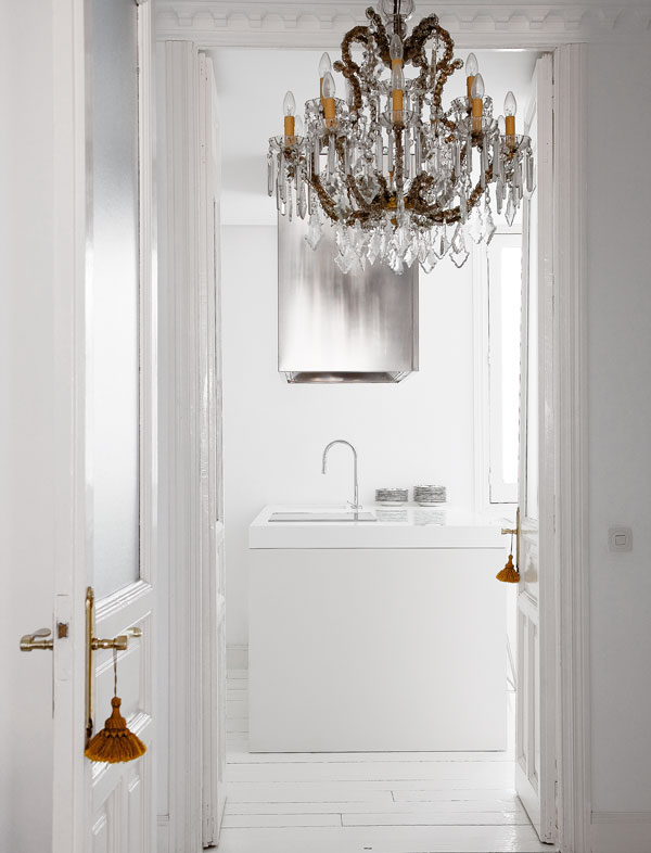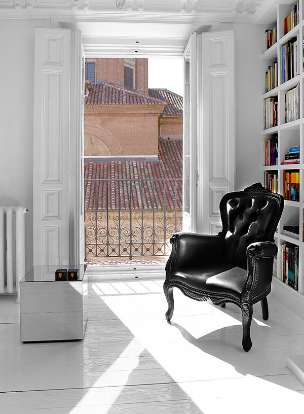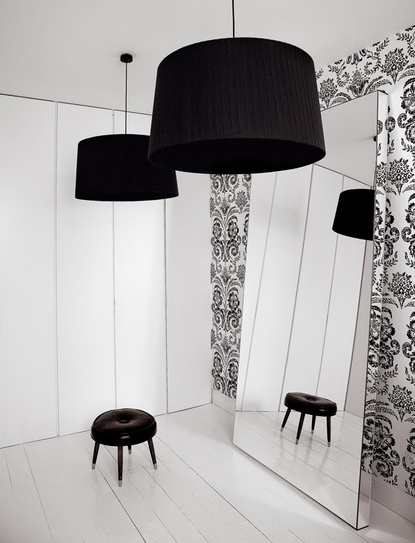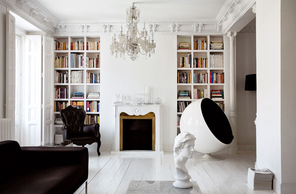 Sobre el fondo blanco, y junto a los detalles negros, algunas piezas clásicas de diseño ayudan a dar el aire contemporáneo a este impresionante piso: la Ball Chair de Eero Aarnio, las butacas Shell de Hans J. Wegner, la lámpara Arco de Flos, la Smoke Chair de Maarten Baas, o las Carbon Chair de Bertjan Pot & Marcel Wanders se unen a piezas experimentales como el sofá chaise-longue Hockney del arquitecto Eero Koivisto para David Design. Algunas antigüedades como las lámparas de araña traídas de Paris y diseños propios de Polo, como el espejo Twenty-Seven, acaban de rematar la decoración de esta ecléctica pero refinada vivienda
