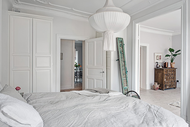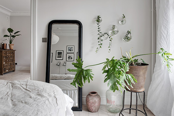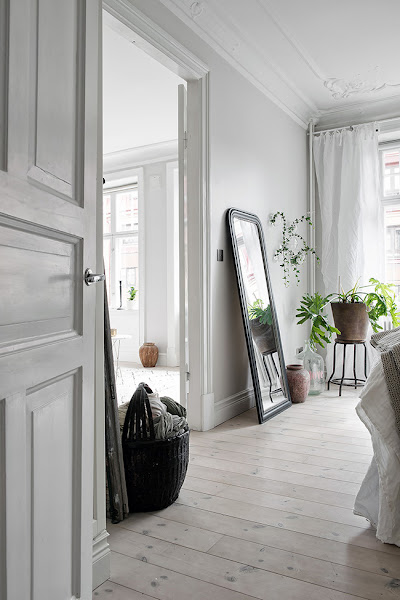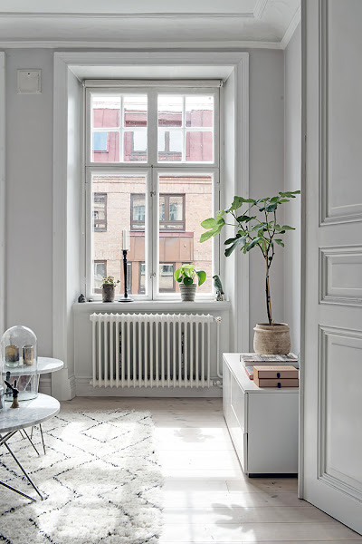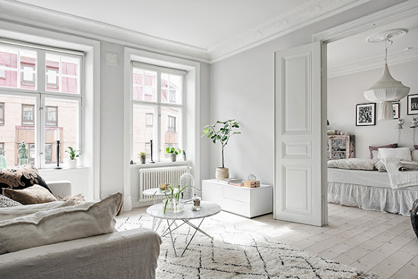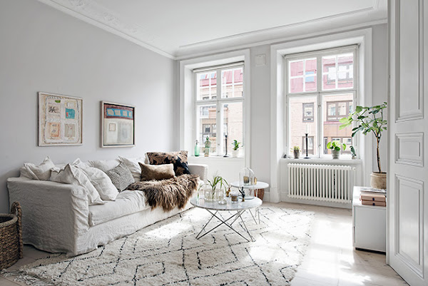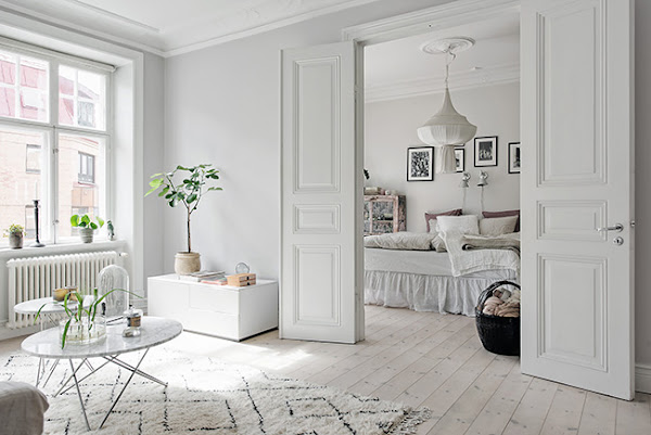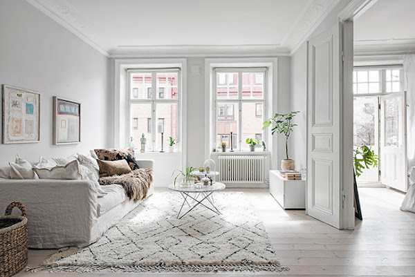Entre todo este no parar hablaba el otro día con una de vosotras sobre lo que sería vivir en un piso antiguo, de techos altos y puertas de madera con grandes ventanales. Coincidíamos en que la idea nos encantaba y casualidades del destino encontré este precioso piso nórdico decorado con un gusto exquisito. El salón al más propio estilo TOTAL BLANCO o WHITE es una estancia luminosa y acogedora, las plantas naturales es el único toque de color lo que le da mucha vida.
