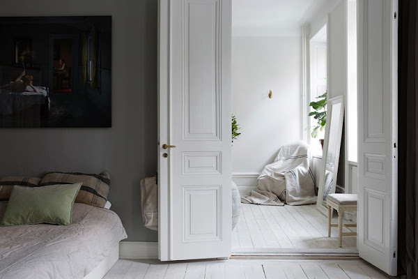 Buenos días! Ya sabéis que no soy muy de verdes en decoración, sin embargo este apartamento sueco en tonos blancos, grises y pinceladas de verde me ha encantado. Creo que la mezcla de muebles de diseño con piezas de herencia restauradas, es un gran acierto (como casi siempre). La luz, potenciada por los suelos también pintados en blanco, las grandes ventanas y los techos altos, es también muy protagonista en la vivienda. Así que, los toques en verde en complementos, plantas, etc consiguen enriquecer el conjunto, dándole mucha personalidad.