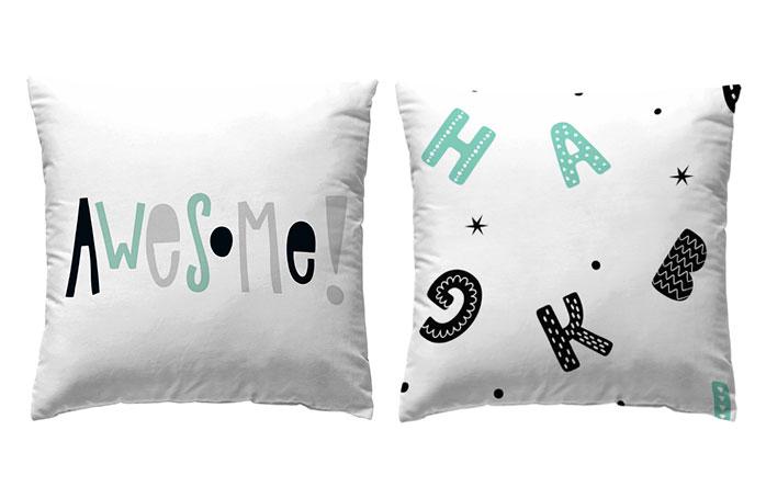 La propuesta de Norkids se completa con imaginativas fundas de cojín para dar ese toque original y diferente a habitaciones de niños y jóvenes, como son la funda de cojín Awesome o la funda de cojín Alphabet, que tanto por colores como por diseño, coordinan muy bien con el resto de textiles cubrecama.