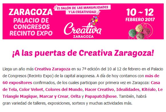 Así que.. como no podía faltar, este año también vamos a asistir a Creativa Zaragoza. Todavía no hemos tenido la oportunidad de ir a Zaragoza a ofrecer ningún taller, así que cuando nos lo ofrecieron no nos pudimos negar. Me consta que hay bastantes lectoras de la zona así que nos encantará poneros caras y charlar un ratito. Nos va a ser imposible salir del estand pero un ratito si que lo tendremos libre.