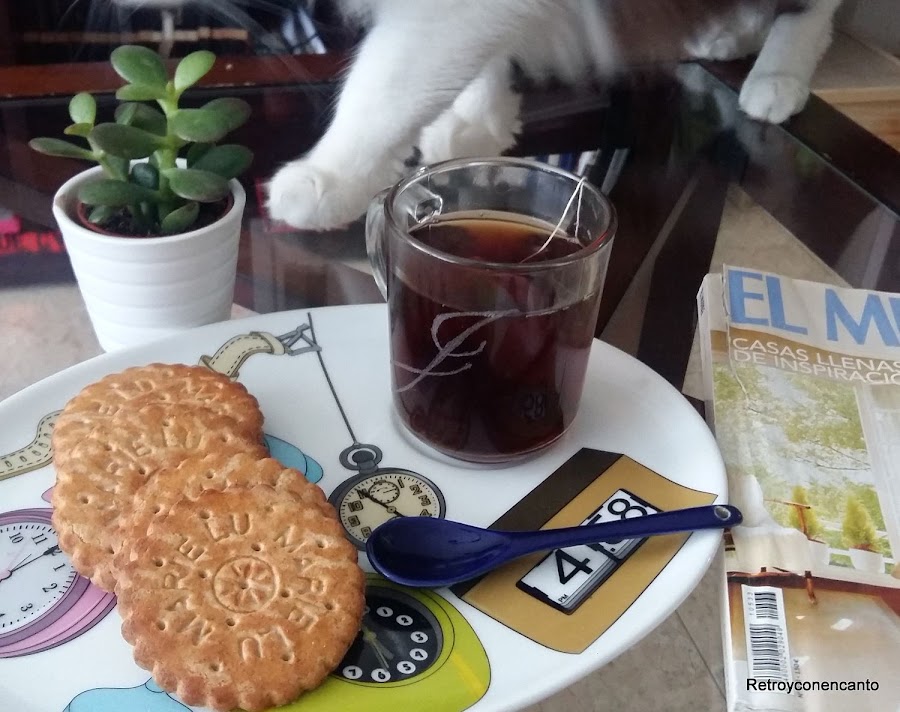 Además de que no venía con las manos vacías. Como hemos anticipado arriba, Nieves es una enamorada de las manualidades, la redecoración de muebles, la costura... y mirad con qué dos tazas personalizadas nos obsequió: para la que toma té...