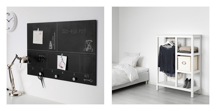 Me parece perfecta la solución de pequeño armario auxiliar para un dormitorio de invitados por ejemplo, el organizador con colgadores de pizarra es un fichaje deco que me encanta también para poner en casa sobre una mesa de trabajo, o las lámparas de globo y nube para un dormitorio infantil... son guays!