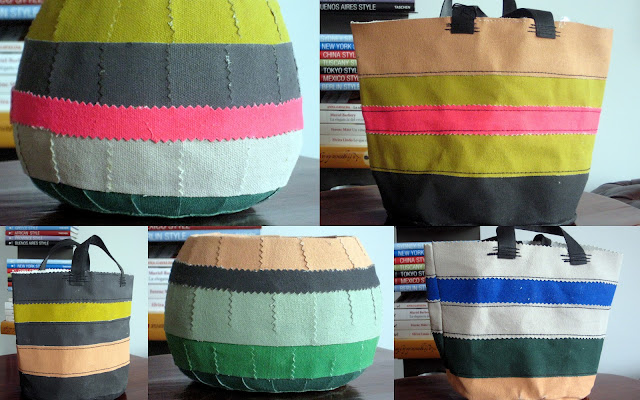 Cuencos rígidos y bolsos plastificados en el interior , realizados con retales de tela pintada , ideales para colocar plantas u otras cosas.