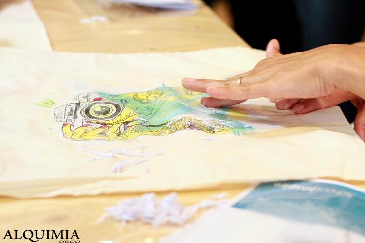 Alex, nos explico de una forma genial como se transferían las imágenes a la tela y nos pusimos a ello. Nos reímos un montón y aprendimos todos los secretos de esta técnica que a decir verdad es muy fácil. Nos contaron también que cada lunes impartirán un nuevo monográfico para ir conociendo todos sus productos, así que al quedarme cerquita de casa creo que me voy a pasar más de un día.