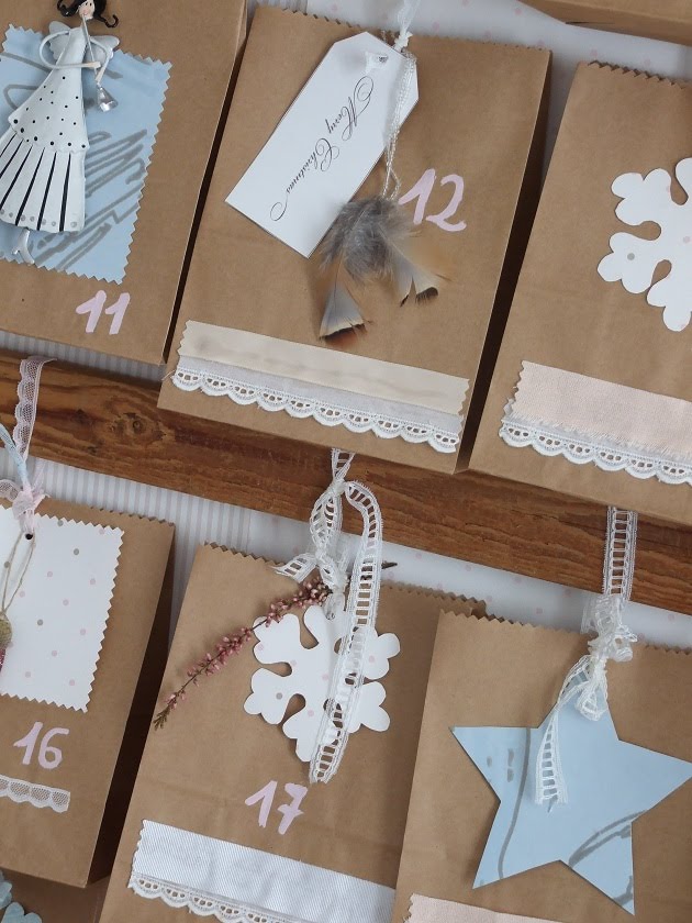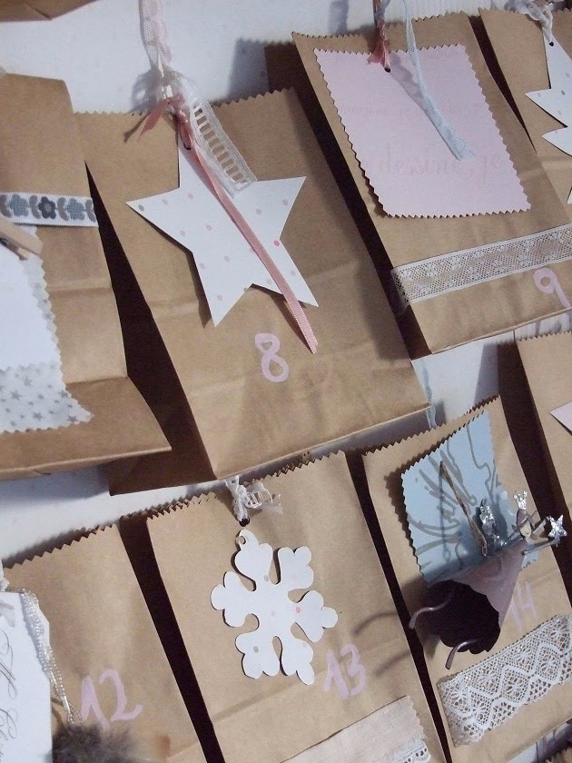 El de este año ha sido más entretenido pero nada complicado, hemos usado muchos restos de papel pintado en tonos soft , rosa , celeste mucho blanco... para formar figuras que me recuerdan a la navidad , como los copos de nieve, las estrellas o los abetos . También hemos usado cintas, encajes lazos y algunos adornos de años anteriores como las bellotas hechas con purpurina.