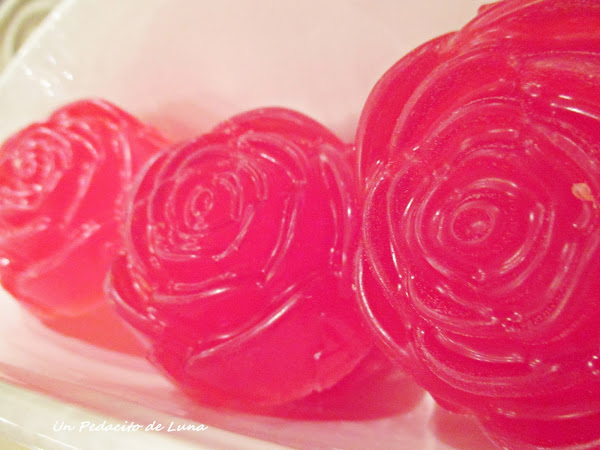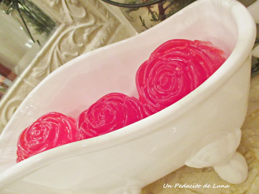 ...Y en la bañera, unos jabones de rosas que hice con glicerina, esencia de fresas, colorante alimentario rojo y aceites de rosa mosqueta y argán.