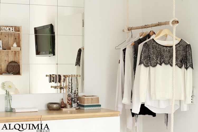 Para el colgador, hemos decidido quitar el que teníamos antes y colocar unas cuerdas con un palo de madera, así integrábamos un poco mas esa zona en la habitación, no se, el carro de ropa de metal no me acababa de gustar, así que por el momento, asi se va a quedar durante mucho tiempo.