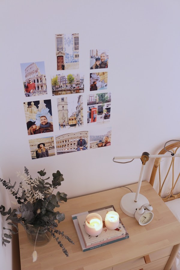 Después haz la composición en el suelo, así puedes ir variando y ver cómo te gusta más. Una vez terminado, empieza a colocarlas en la pared con cinta de doble cara y, ¡listo! Un DIY genial en menos de 30 minutos.