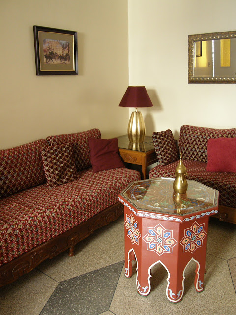 Comenzamos con el salón típico, en el que normalmente no se hace mucha vida y se reserva para las visitas, aunque en nuestra casa no seguimos la tradición y es el que utilizamos a diario. Mobiliario en madera y unas "catifas" que rodean toda la estancia para poder albergar cuántas más personas mejor. La decoración en tonos granates y una mesa de centro tradicional pintada en los mismos tonos que los textiles, para mí, lo mejor de la estancia. Deciros también, que todo el mobiliario ha sido realizado por un carpintero a medida y en la madera elegida.