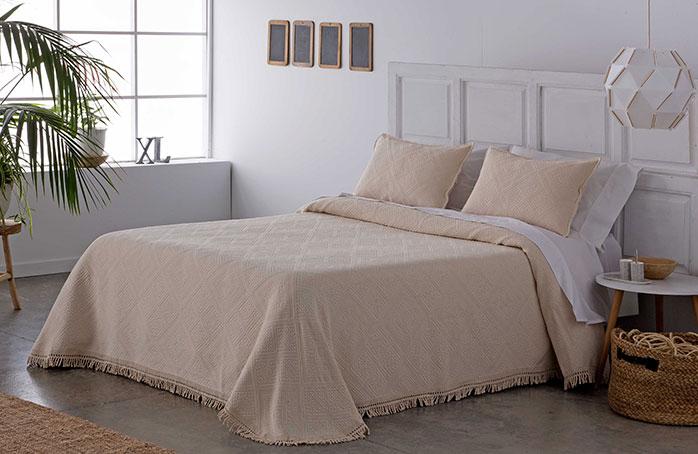 Teniendo en cuenta que nos encontramos en verano, temporada de altas temperaturas, y que apetece vestir la cama con textiles frescos, la opción perfecta puede ser la colcha Paga, una fina colcha de verano 100% algodón, con un sofisticado diseño de rombos, y rematada con flecos.