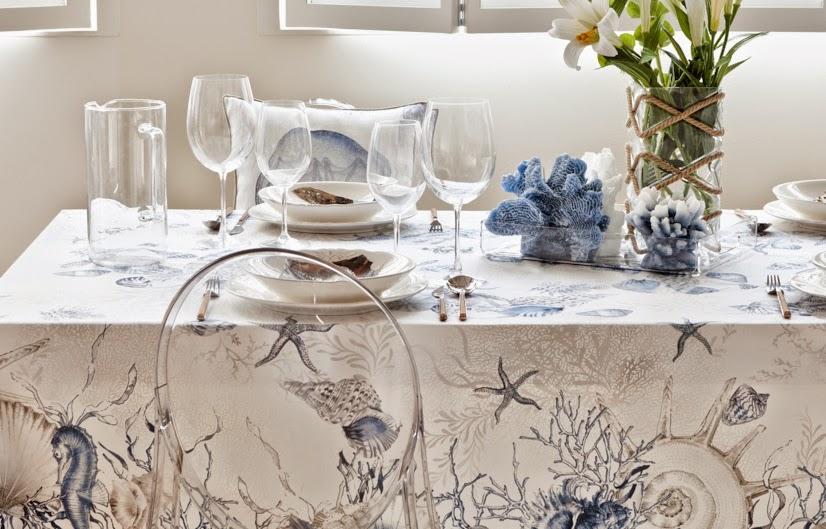 En la colección, tanto para ropa de cama, como para artículos de mesa o decoración destacan el blanco y la diferente gama de tonos azules que evocan al mar y los elementos vegetales y animales de las profundidades de los océanos.