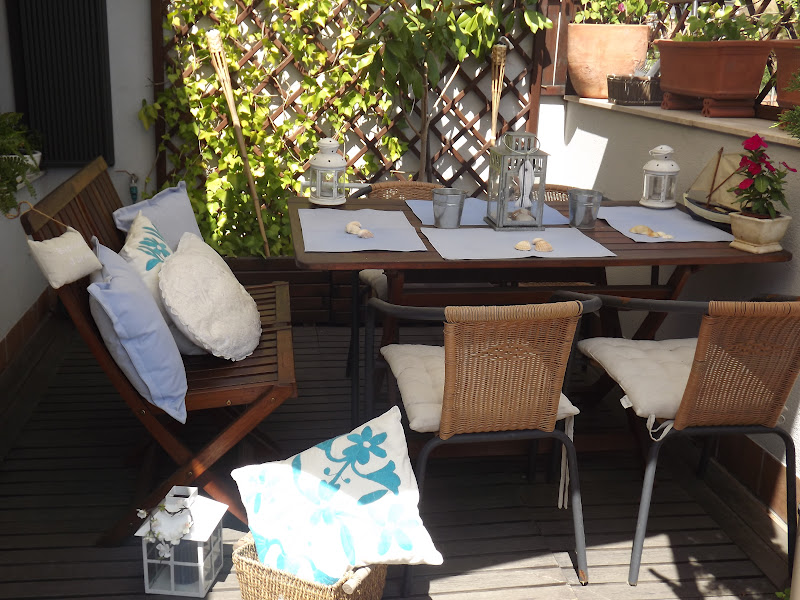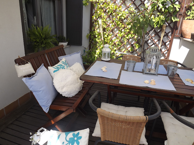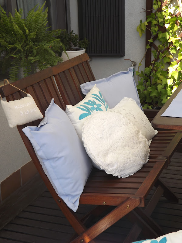 Hoy estrenamos nuevo mes,Agosto,y yo estreno nuevo banco de madera para mi terraza...es de madera de teca como casi todo el mobiliario que compone la terraza,lo hemos comprado en "Jardiland",un garden que nos encanta y hoy ya luce arriba para sentarnos y disfrutar de las tardes de verano...Le he colocado cojines en azul y blanco,muy marinero,combinando perfectamente con los manteles individuales,los faroles blancos de Ikea,los cubos de zinc,las conchas y el barco.Tener un banco en la terraza es una buena opción para tener asientos extras cuando vienen amigos y familiares...ya estoy deseando organizar una cenita con la terraza llena de amigos,una buena comida y, como no,los mojitos que tanto apetecen en las noches calurosas.Despedimo Julio que nos ha brindado cálidos momentos junto al mar y la piscina,y recibimos Agosto,mi mes tan deseado,me esperan días de sol,descanso, vacaciones junto a los mios y una escapada maravillosa al Sur,a las preciosas playas de Huelba.Con todo ello os deseo un miércoles para soñar con un nuevo mes que se inicia y en las ya tan esperadas vacaciones.
