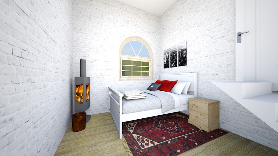 La otra parte de la habitación tiene una gran puerta enorme que su propietario quiere convertir en ventana, así aprovechamos esta zona para poder instalar la cama, la mesita de noche y una fantástica estufa pelet para no pasar frío en invierno.