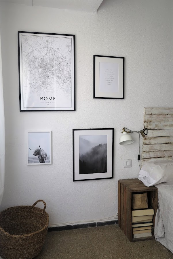 Pero lo que más destaca es la composición de marcos que hay al lado de la cama. Tanto los marcos como los pósters son de la web de Desenio. Sabéis que me encanta decorar la casa con fotografías en blanco y negro, y aunque las suelo apoyar, me apetecía probar algo nuevo y colgarlas y no he podido quedar más contenta con el resultado. Os dejo debajo los nombres de todos los pósters para que os sea mas fácil encontrarlos.
