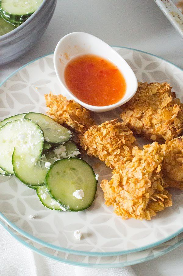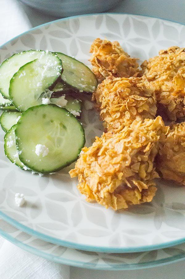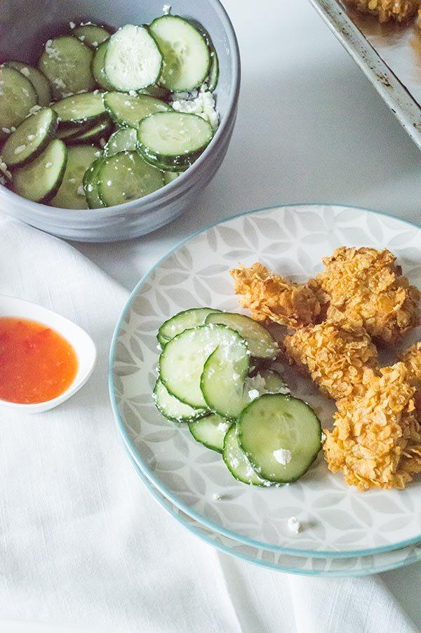 Para rebozarlos he usado harina de garbanzos mezclada con pimentón, ajo y cebolla en polvo, pero vosotros podéis usar lo que mas os guste, una harina de trigo normal o integral, y por supuesto las especias que mas os apetezcan! Para acompañar yo he usado una vinagreta agridulce de lima y una ensalada de pepino y feta.