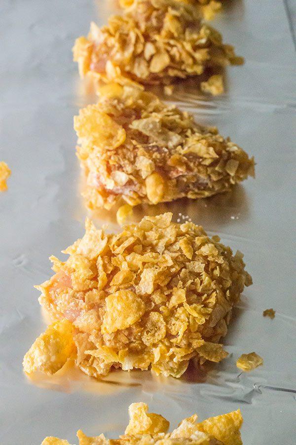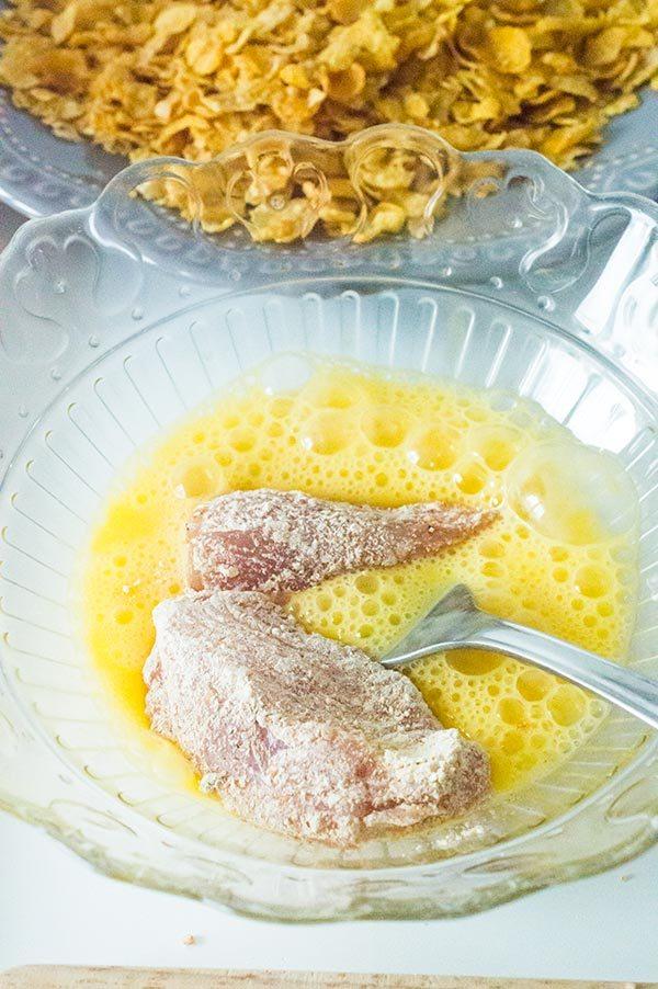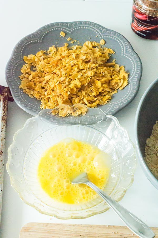 Rebozamos los trozos primero en harina, después en el huevo y mas tarde en los copos de maíz.