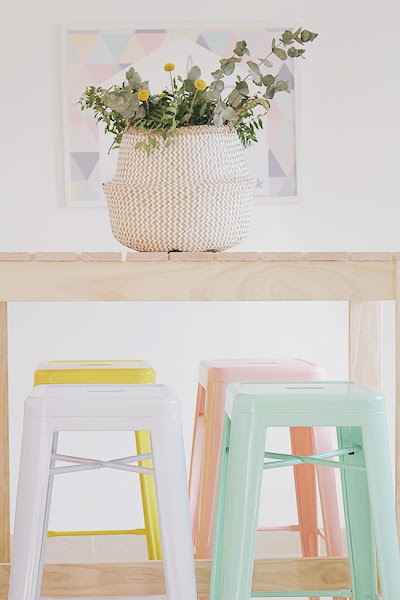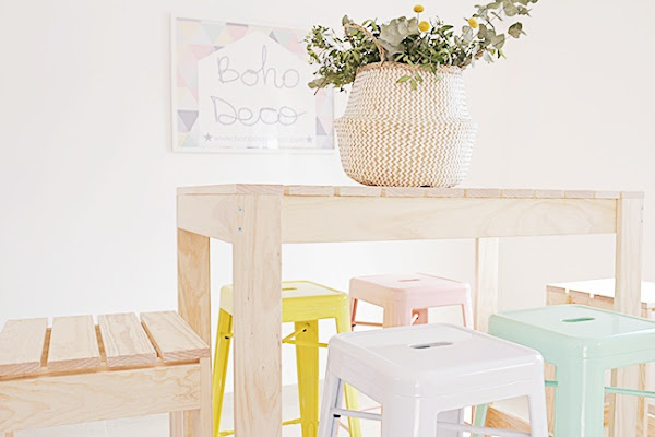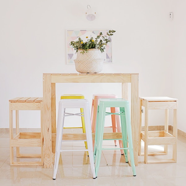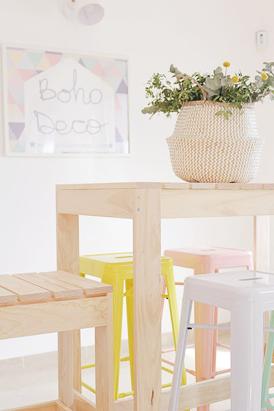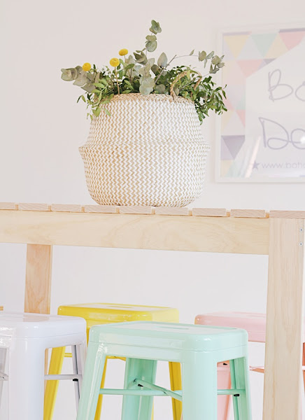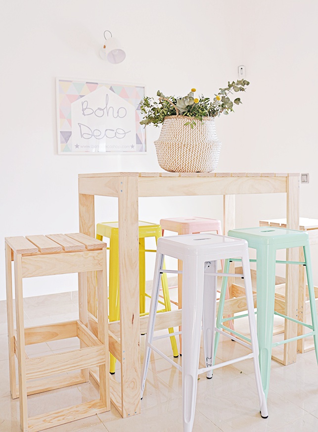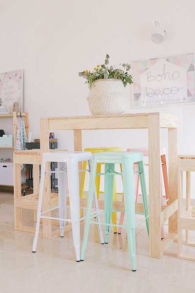 Al mudarme a Barcelona he tenido la suerte de dar una nueva vuelta a la oficina de Boho y hacerla mucho más luminosa y espaciosa. Hoy os quería mostrar la zona de reuniones, presidida por una mesa alta y con los taburetes de Sklum a juego con los colores de nuestro logo, ¿qué os parece?