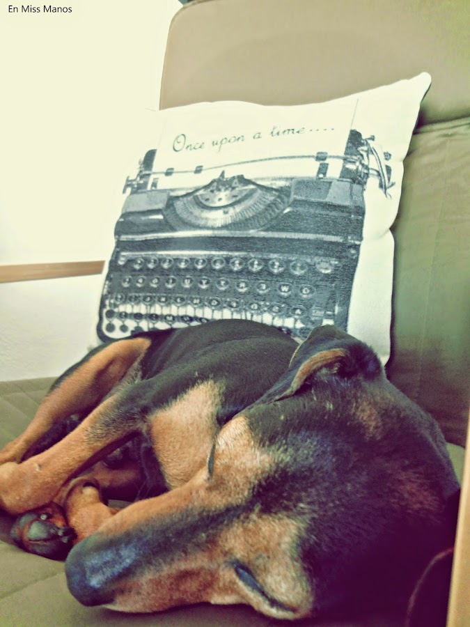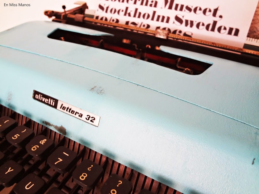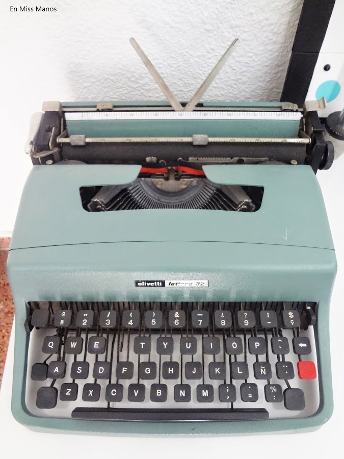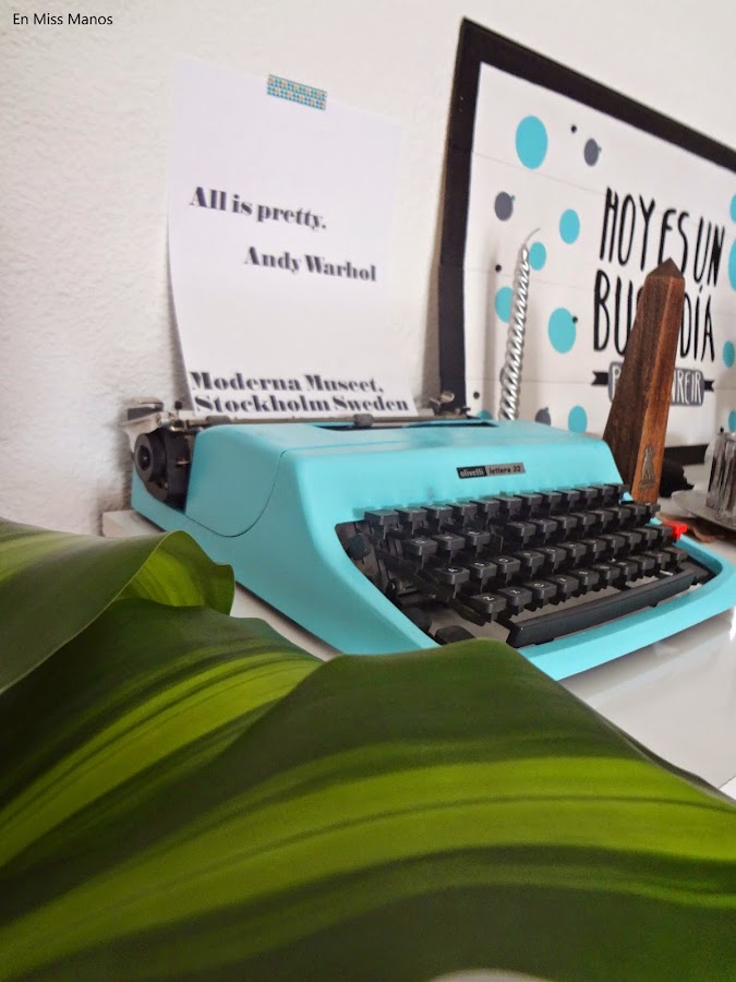 Y como hace un tiempo volví a guardar la máquina de escribir antigua, pensé en volverla a sacar y pintarla en turquesa, para ir a juego con el salón y el cojín.