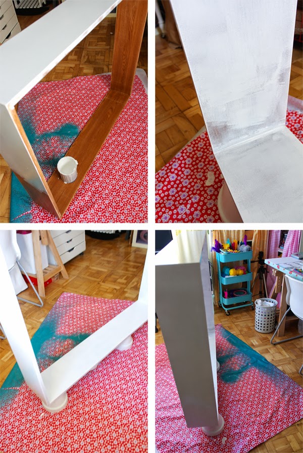 Abajo podéis ver parte del trabajo que hice con el marco. Quería lacarlo igual que hice con el resto de muebles del salón por eso le dije a mi carpintero que usase cualquier sobrante de madera que tuviera por el taller porque igualmente quería lacarlos yo misma. Un par de capas de imprimación todoterreno de Baisser y otro par de capas de esmalte al agua blanco satinado de Bruguer, aplicadas con rodillo flocado para lacar y listo.