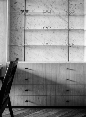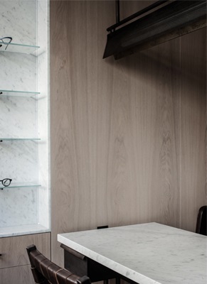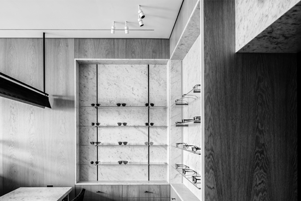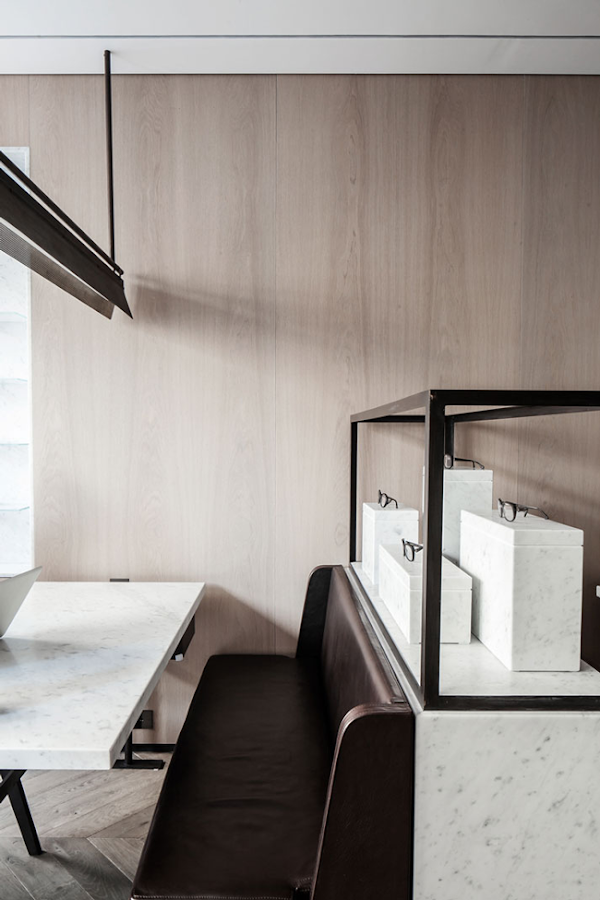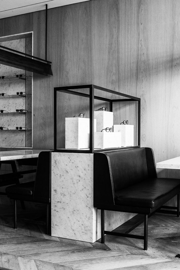 Pura elegancia masculina y un auténtico lujo de materiales, mármol de carrara, paredes de roble cepillado, cuero oscuro y bronce. Un maravilloso parquet de roble, mobiliario de lineas sencillas a medida e iluminación suave dan forma a Sonkes Opticiens.