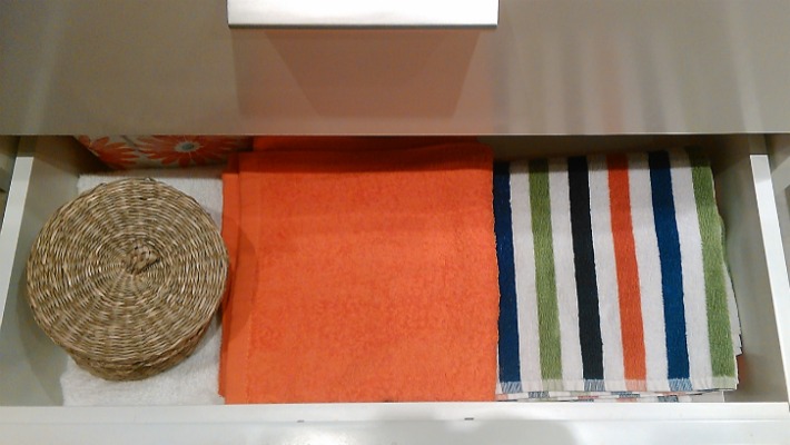 El segundo cajón lo hemos dejado para las toallas, bien dobladas y el cestillo mas grande de junco marino para los geles y champú de unidosis que usan mis hijos para el deporte escolar.