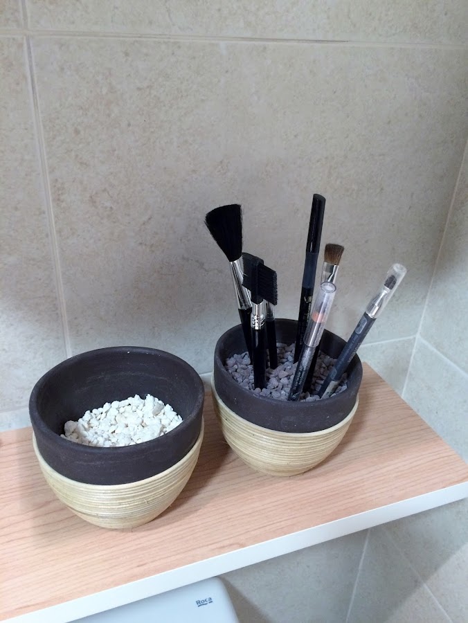 Utiliza pequeñas piedras para decorar, y a la vez fijar, los utensilios que más uses a la hora de maquillarte.
