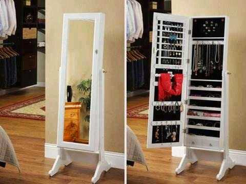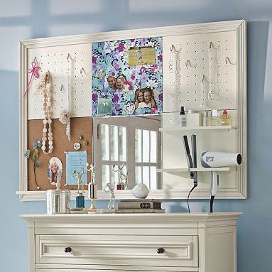 La primer idea es usar el espacio donde tengo el espejo para poner algo similar a este donde se pueden guardar desde aretes, collares y hasta gafas de sol, mi espacio para el espejo es la mitad de este, así que tal vez deba mandarlo hacer a la medida o encontrar un mueble similar y tunearlo