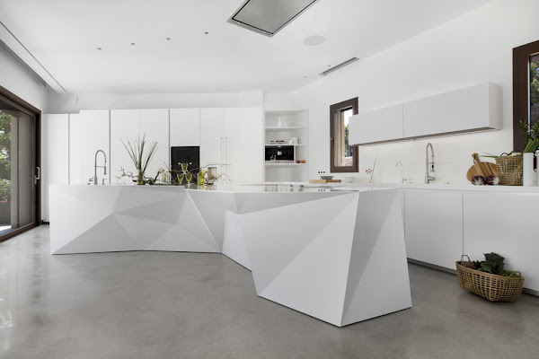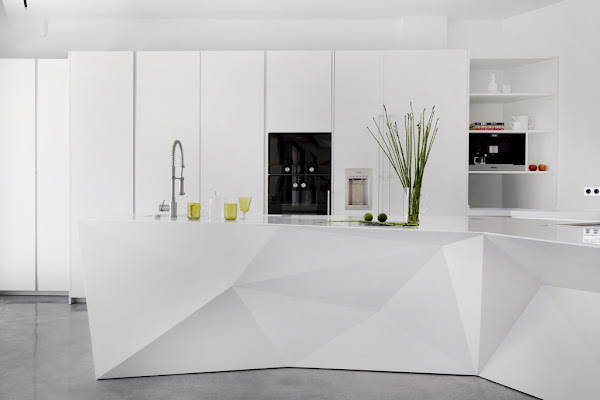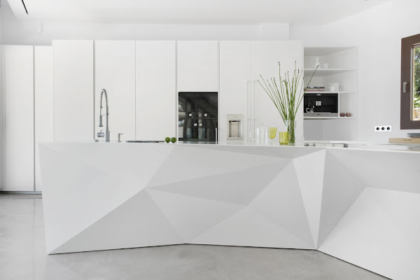 En este proyecto liderado por el arquitecto Miguel Arenas para Cocinart, perteneciente al Grupo Espacio HDG, se han empleado 7 planchas de 365x76 cms. cada una, del color Glacier White de Corian, para crear una isla de 6 metros de un diseño que recuerda el arte de de origen japonés de doblar papel, también llamado Origami, en un alarde de creatividad e imaginación.