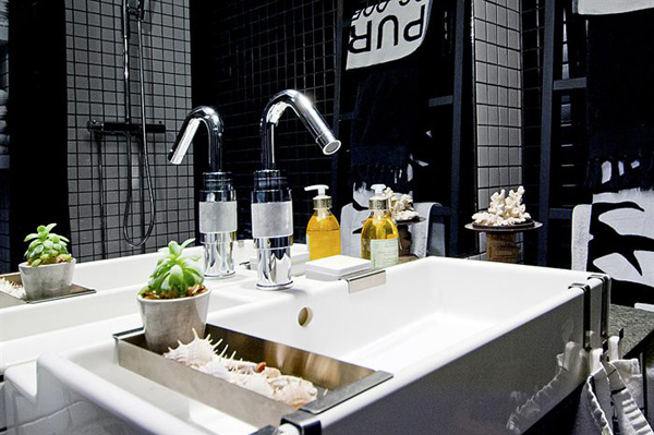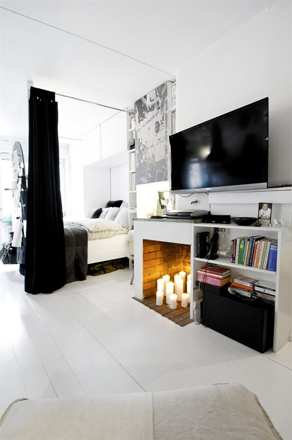 Los toques de calidez vienen de la mano de las telas usadas, la madera es detalles puntuales y la chimenea de ladrillo. Sillas de diseño Panton en negro que se mezclan con otros modelos como la Tolix, las de jardín etc; piezas vintage y estilo son la imagen de un apartamento a priori escaso, pero lleno de todo lo que se necesita. La clave de esta vivienda que me ha enamorado es su estilo industrial en blanco y negro y que los muebles, estando todos los necesarios, están distribuídos de tal manera que no impiden la circulación y da la sensación de amplitud. Piezas pegadas a las paredes, colores y tonos claros y zonas puntuales de negro para crear profundidad y llamar la atención son las claves de este Mini Piso. Se mezcla los acabados de una zona y de otra para creando una armonía visual que unifica toda la zona abierta.