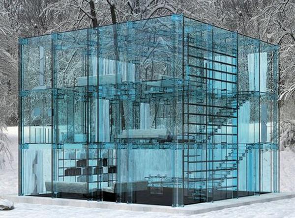 Esta ultima foto si os fijáis bien es la habitación de matrimonio que esta en un segundo piso , en este caso todo es de cristal. Debajo de estas palabras esta la foto de toda la casa , la casa es un proyecto de Carlo Santambrogio y Ennio Arosio , fue diseñada toda de cristal incluyendo los muebles del mismo material , tiene que ser toda una experiencia vivir en una casa con estas características.