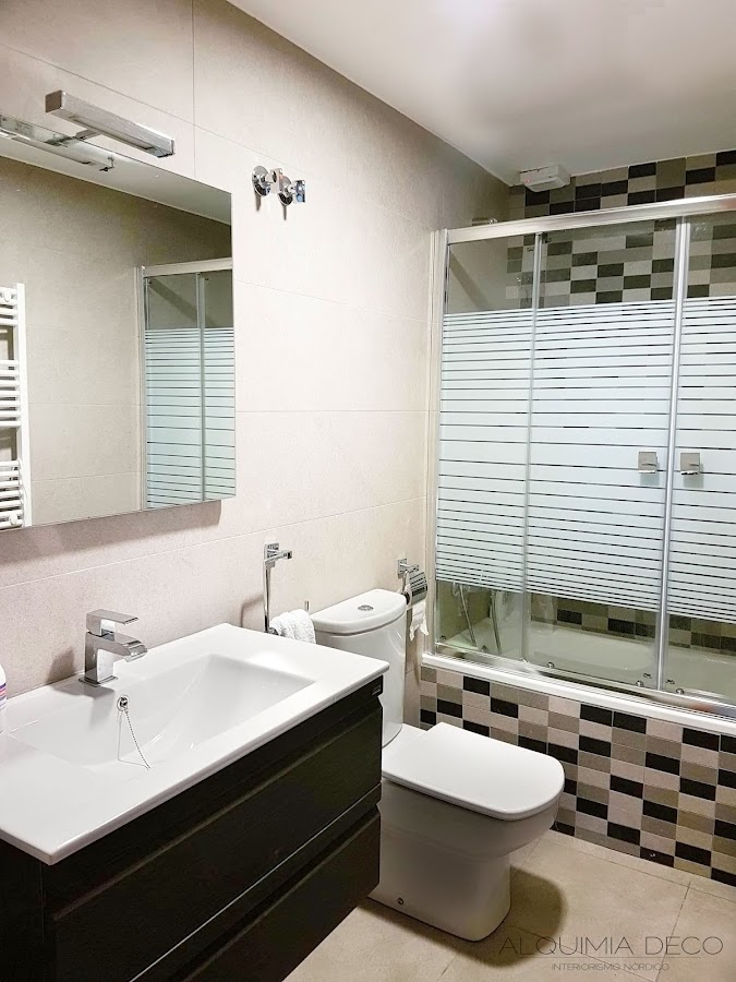 Por la puerta del fondo se accede al baño que hay dentro del dormitorio, como veis es un baño muy elegante y con un plato de ducha. Hacía muchísimo que queríamos tener un plato de ducha ya que siempre hemos tenido bañera en casa, así que aquí estamos encantadísimos porque en uno tenemos plato y en el otro bañera.