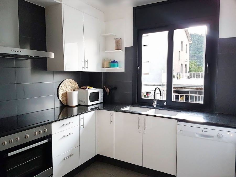Desde el salón se accede a la cocina. La cocina tiene un buen tamaño, ni muy grande ni muy pequeña y además tiene un montón de almacenaje para guardar todas las cosas. Dentro de la cocina hay una pequeña despensa que nos va a ir genial para guardar todo aquello que no sabes donde colocar o simplemente, un poco de almacenaje para las cosas de limpieza del hogar etc.. también está la lavadora.