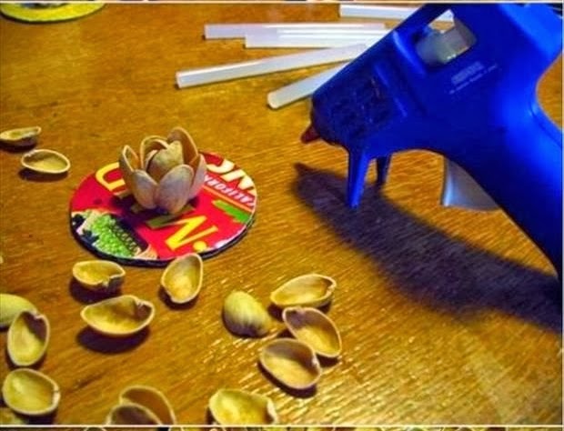 Corta el cartón y empieza ha hacer el corazón de la flor , piensa que la posición de las cascaras de pistacho es .... contra mas en el centro de la flor estén mas rectas hay que ponerlas , aplica la silicona caliente y pon la cascara encima aguantándola un poquito.