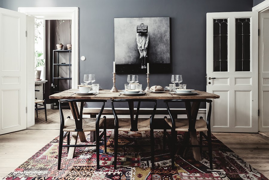 La vivienda, es pequeña en su globalidad, pero en ella se alojan todas las necesidades de un hogar en espacios sorprendentemente grandes a la vista, pues se encuentra fantásticamente distribuida. Encontramos distintas piezas que le aportan un marcado carácter clásico y elegante. Me rechifla el mapa sobre el sofá del salón, las distintas alfombras del comedor y o el pasillo... ¡y la cocina! es espectacular. De modo que, a pesar de la paleta de colores general de la vivienda, la encuentro bastante luminosa y acogedora.