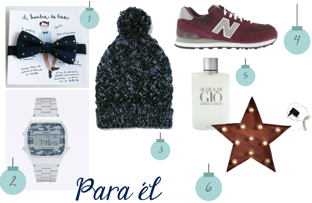 1- Pajarita 2- Reloj 3- Gorro 4- Sneakers 5- Perfume 6- Lámpara
