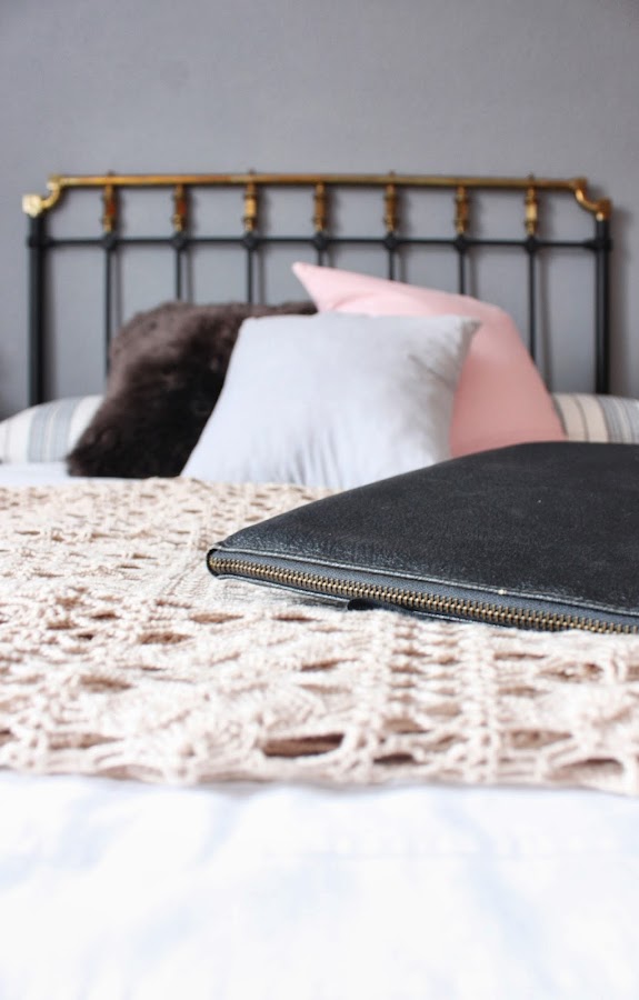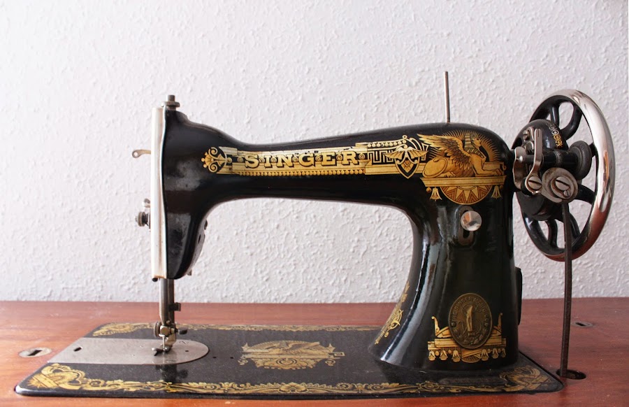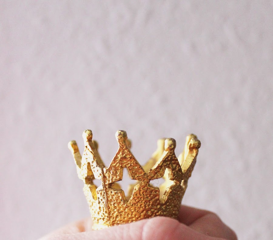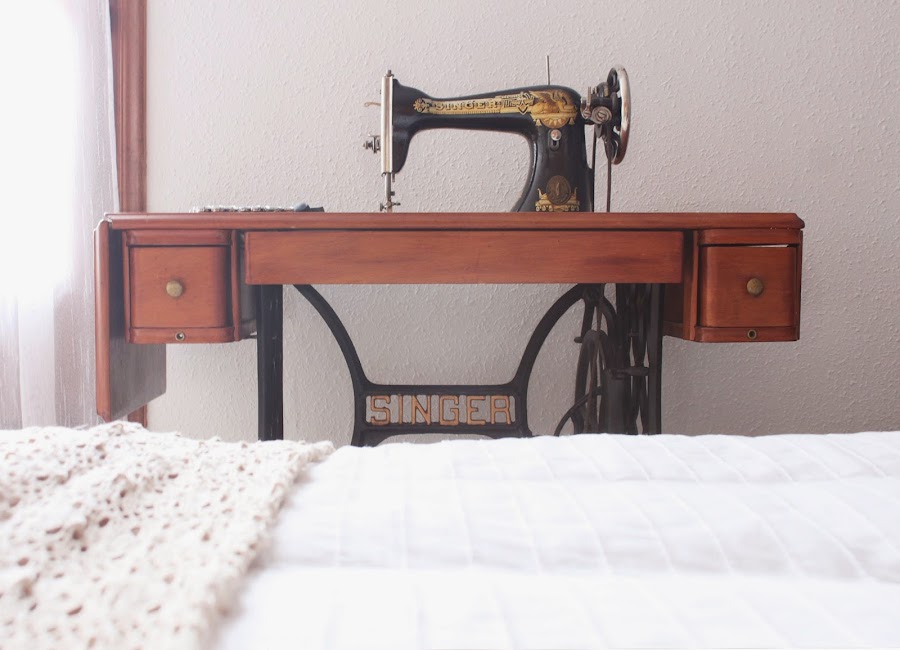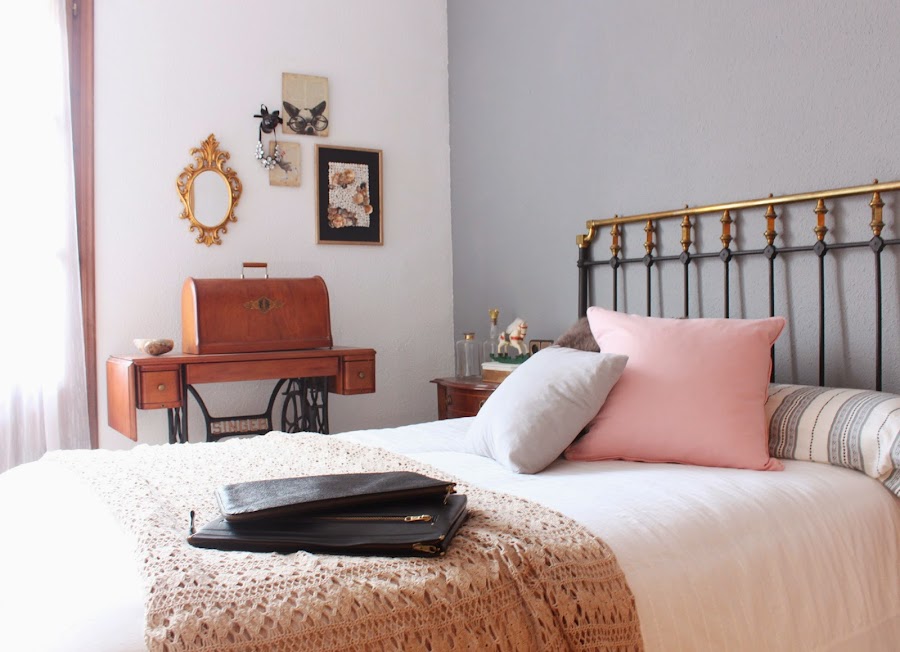 Todo se basa en piezas heredadas, la máquina de coser SINGER de mi tatarabuela, el cabecero de forja de mis bisabuelos, la manta de ganchillo hecha por mi abuela, el espejo... que da un toque de fantasía que me encanta y me recuerda a la peli de Blancanieves, también el tapón de botella con esa corona de princesa.