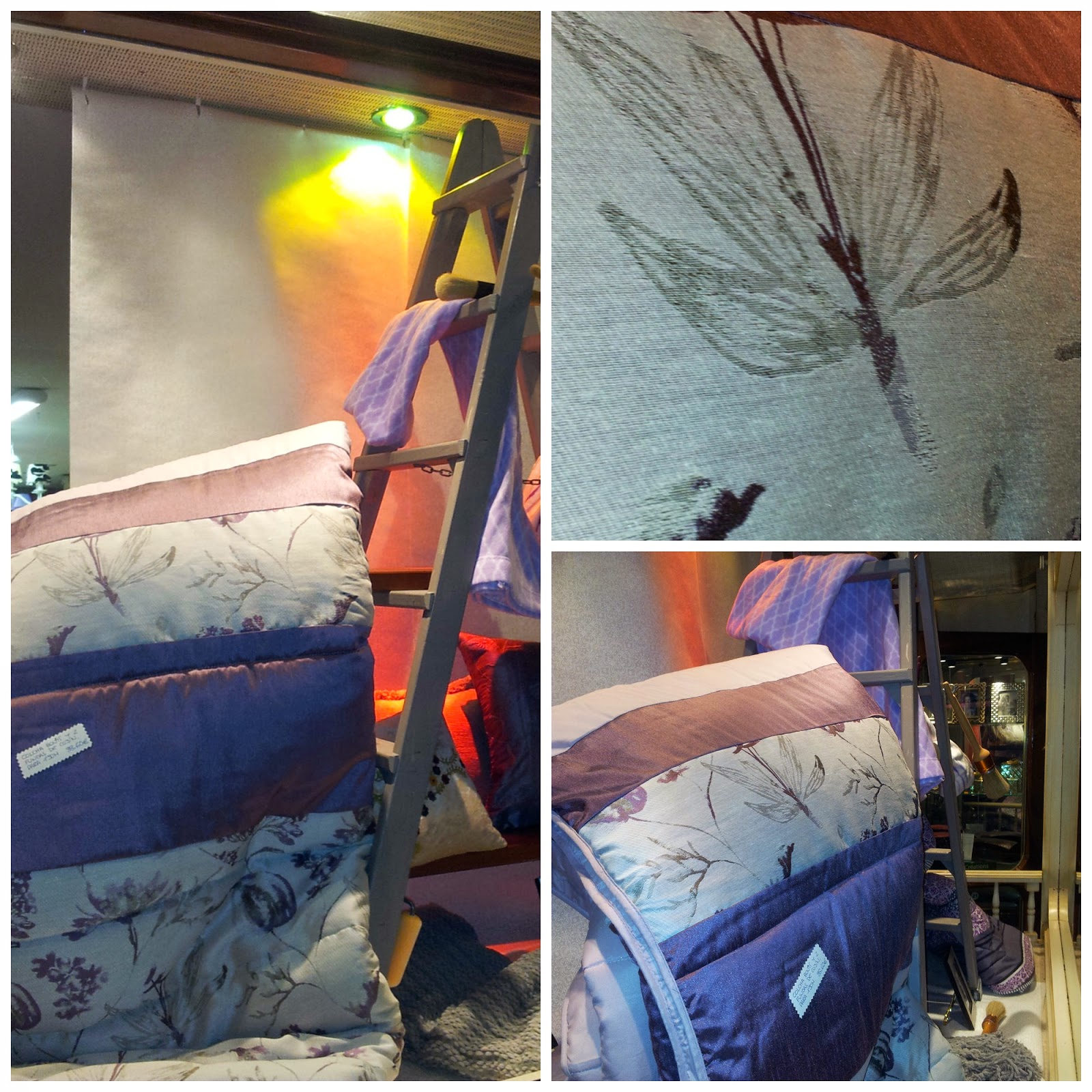 Colchas, sábanas, candelabros... todo en tonos morados y grises.
