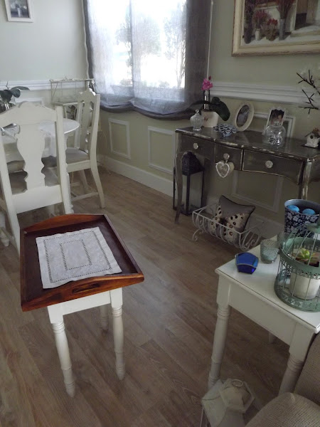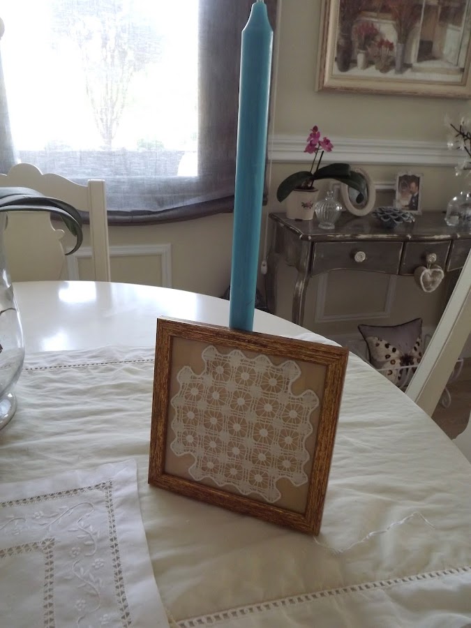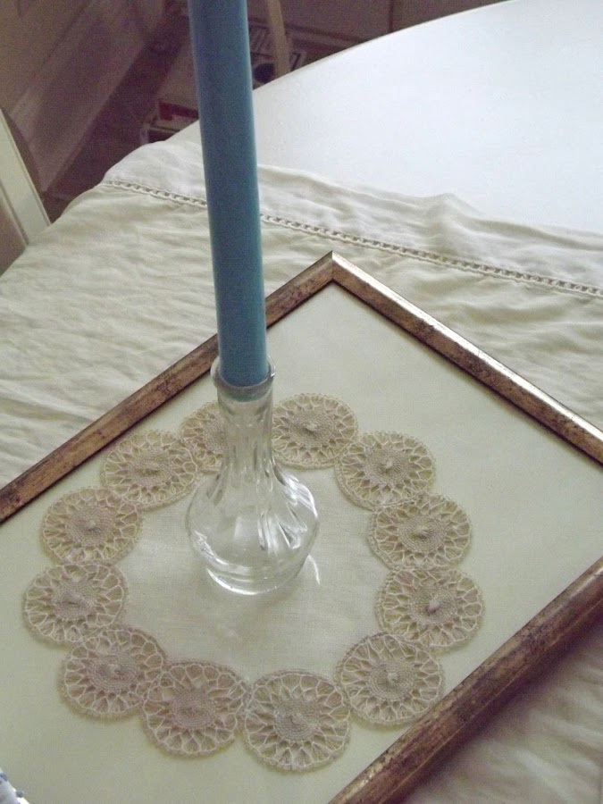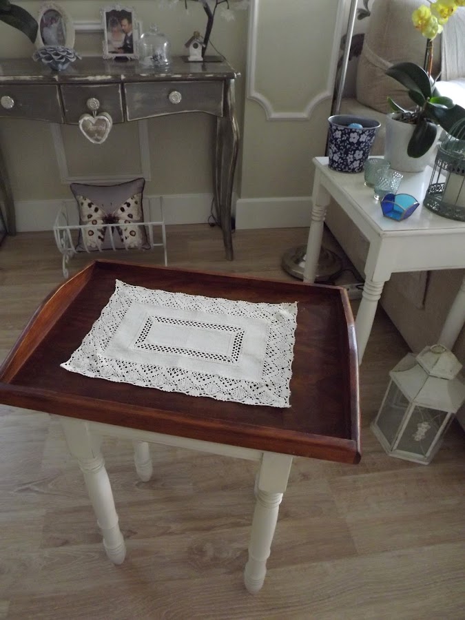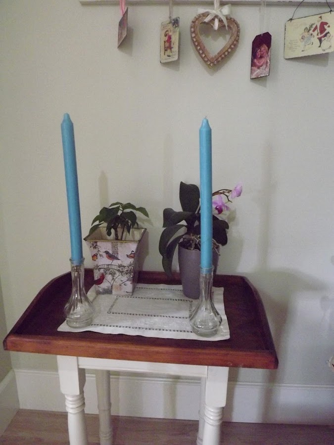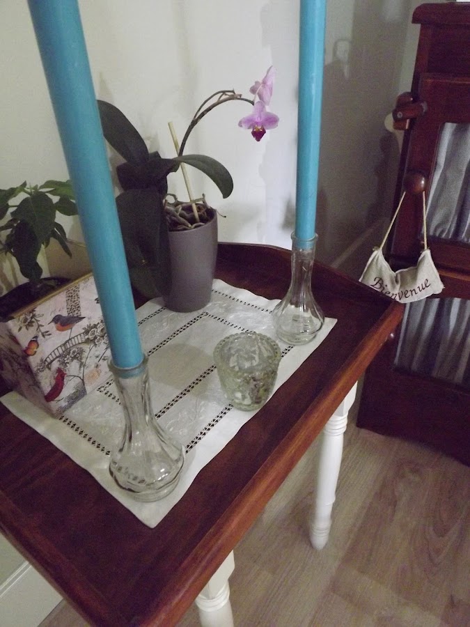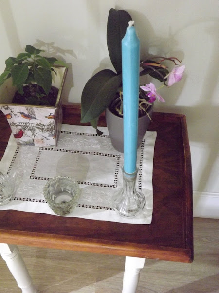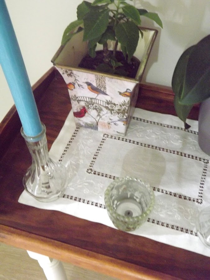 Yo hoy aúno una bandeja barnizada, un paño antiguo, una pequeña mesita, velas, plantas, jarrones y portavelas...