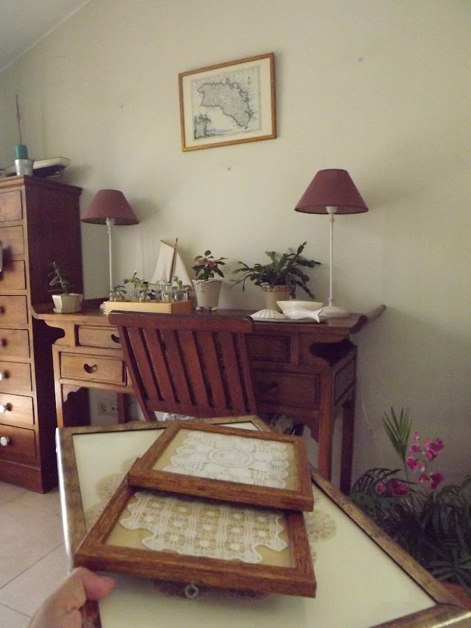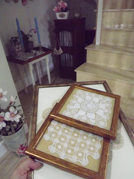 Lo dejo todo a un lado para coger de nuevo mis paños enmarcados, arriba me los vuelvo a subir para ser colocados donde siempre han estado...