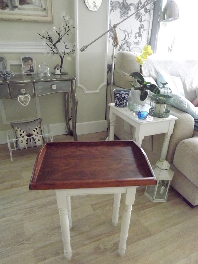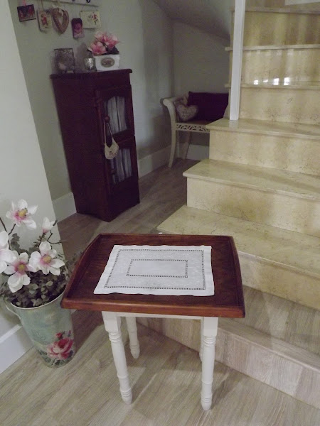 No queda nada mal, parece una mesita auxiliar combinada en dos tonos, blancas las torneadas patas y caoba el sobre que la complementa...