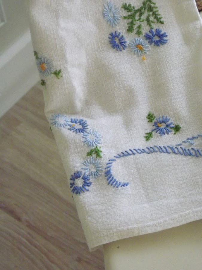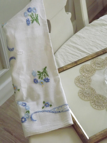 Y que me decís de éste vergelianas. Blanco y bordado con flores en azul. Quien me lo regaló me dijo que era una toalla antigua de las que se usaban hace montones de años en los viejos palanganeros. Pues bien yo la coloco en el lavabo de arriba como tal cuando tengo invitados en casa y os confieso que llega a enamorar...