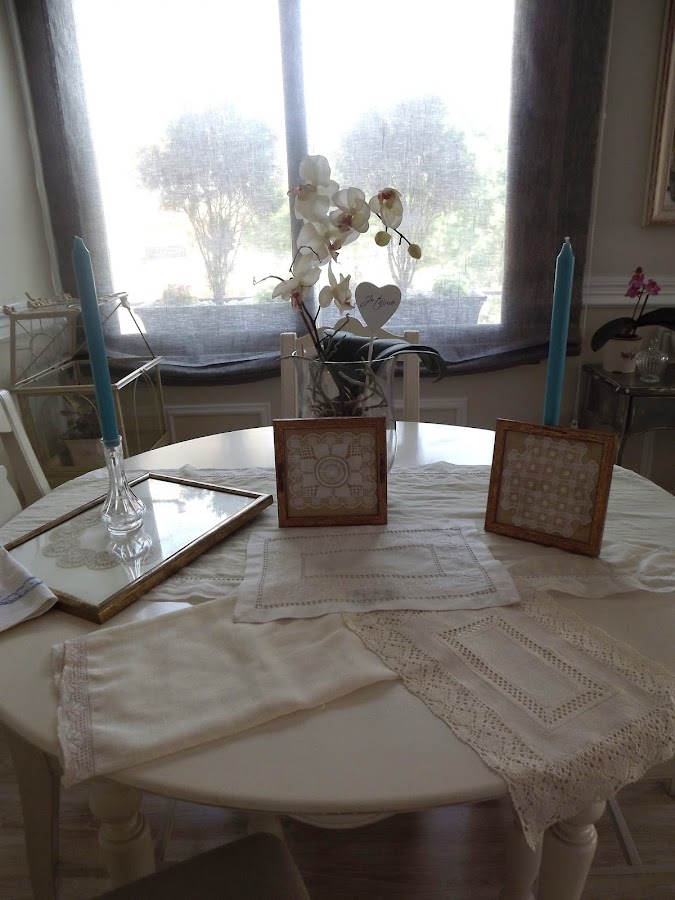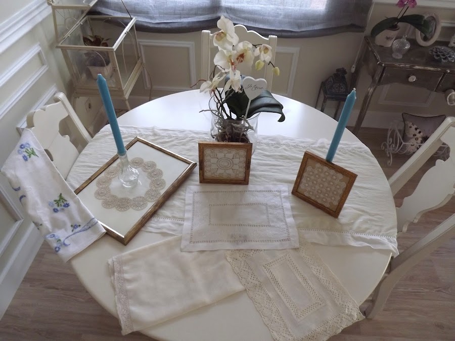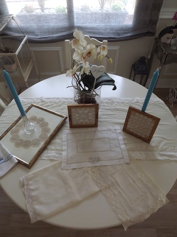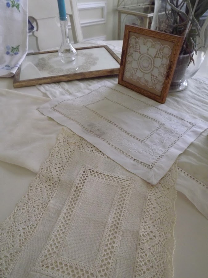 Caminos de mesa alargados, paños más pequeños y otros cuantos enmarcados en cuadros de oro envejecido...
