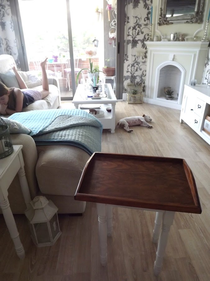 Y ahora viene mi genial idea para compartir con vosotras. Un mesa pequeña, una bandeja de madera oscura...Por cierto, mirad que panorama en casa mientras os lo muestro. Mis dos tesoros tirados a merced del aire acondicionado, todo un poema...