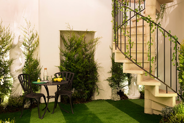Me parece encantador de principio a fin, desde la puerta verde de la entrada de ese muro gris, a cada detalle, al suelo revestido de césped, a la cuidada selección de accesorios, al ambiente y la creación de espacios sencillos, cómodos y divertidos, casi como hacer "glamping" en el centro de una de las ciudades más cosmopolitas del mundo.