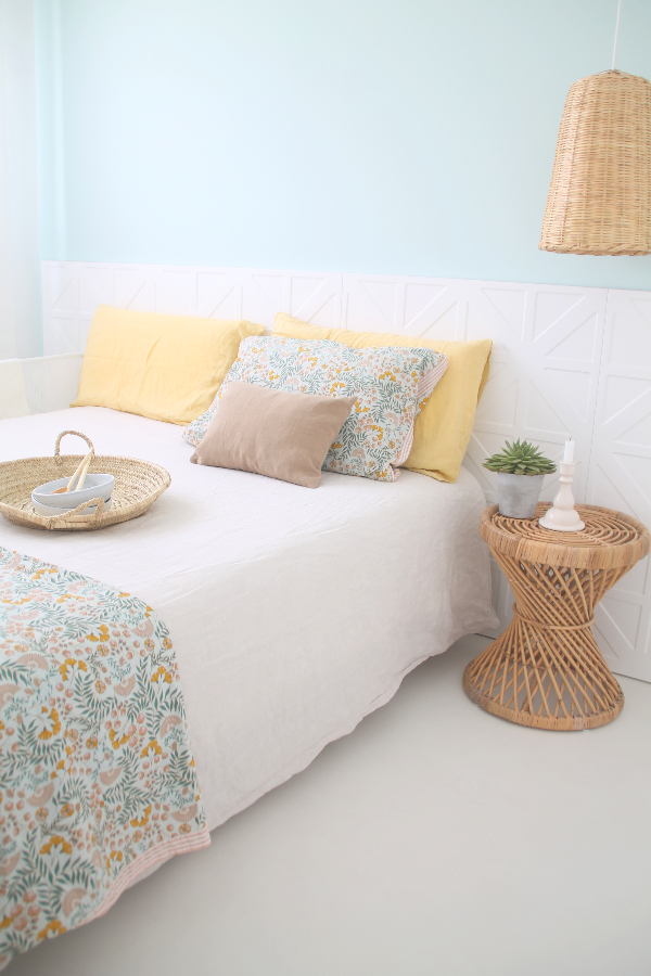 Aquí os enseñamos la pared del dormitorio tal y como está ahora, pintada en un color verdeagua, que aunque es fresco y bonito, resulta algo impersonal.