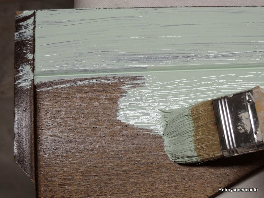 Después de un buen frote con agua y amoniaco (nuestro producto estrella para estos casos), porque a suciedad no le ganaba nadie a la tablita en cuestión, decidimos aplicar tapaporos y pintar con verde mint, tan de moda hoy.