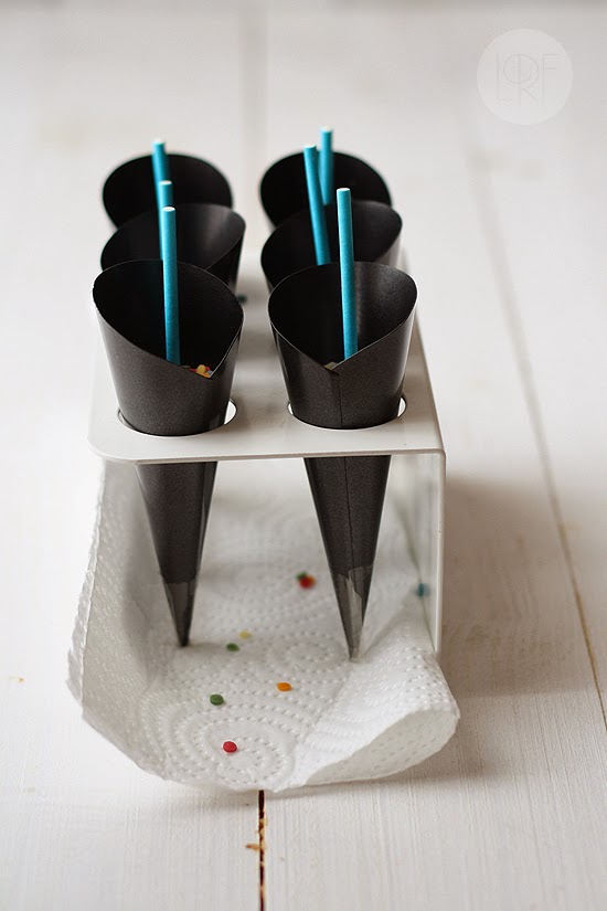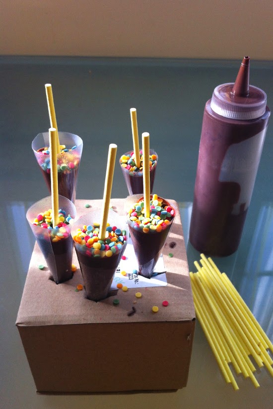 Ponemos el chocolate fundido en un biberón de repostería, y rellenamos con cuidado los moldes (en la foto se ve que sujeto los moldes en un soporte para mangas pasteleras). Dejamos reposar un minuto o dos, y colocamos los palitos.