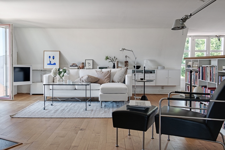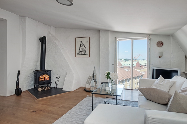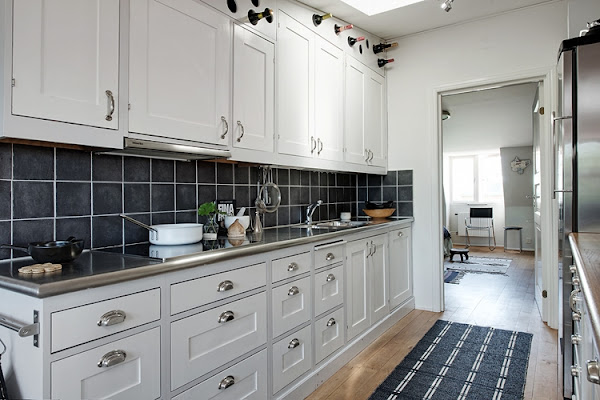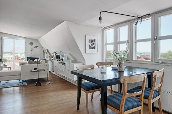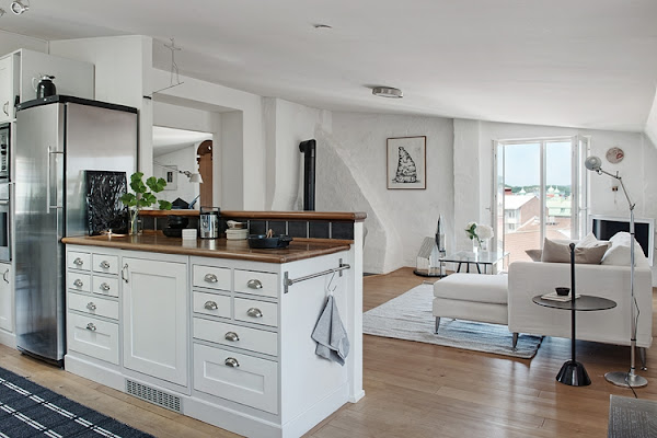 De ella me ha enamorado todo, el rinconcito de la chimenea, las paredes, los techos abuhardillados y sobre todo su distribución, me parece perfecta, ya que la cocina es semi-abierta, es decir, media está cerrada por paredes, y la otra media da al salón, lo que me parece una idea genial para aquellas personas que no acaban de encajarles las cocinas de concepto abierto.